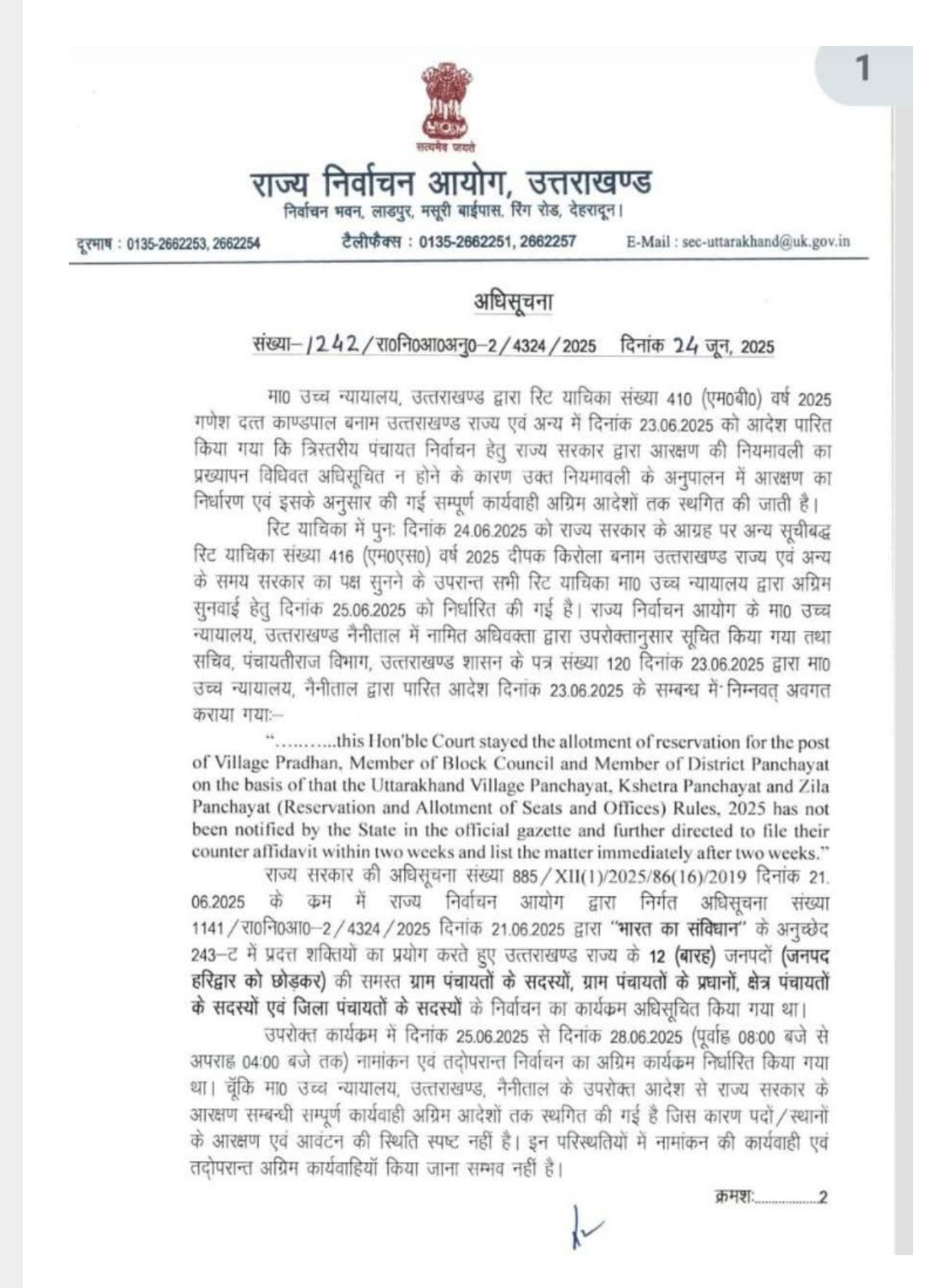 देहरादून, 24 जून 2025 — ( मौ. गुलबहार गौरी) उत्तराखंड में प्रस्तावित त्रिस्तरीय पंचायत चुनावों पर फिलहाल विराम लग गया है। उत्तराखंड उच्च न्यायालय के ताजा आदेश के बाद राज्य निर्वाचन आयोग ने पंचायत चुनाव संबंधी समस्त कार्यवाहियों को अग्रिम आदेशों तक स्थगित करने की घोषणा कर दी है। इसके चलते नामांकन, जांच, मतदान और मतगणना की प्रक्रिया अब अगले आदेश तक नहीं होगी।